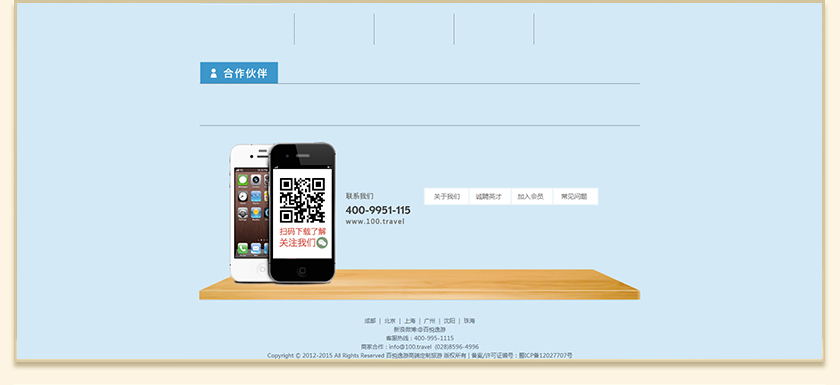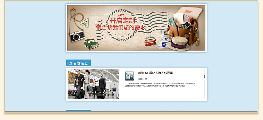 Project Description 百悦逸游于2012年初由二位资深的旅行家创办,是成都传媒集团旗下成都新闻国际旅行社有限公司的高端旅游品牌,总部位于成都高新区天府大道中段美年广场。在百悦逸游成立之前,创始团队亲自到全球三十多个国家实地考察,带着第一手的资讯和执着的信念创立了中国西部第一家真正意义上的私人定制旅行机构。百悦的旅行不是跟团挤大巴,不是十天去十个国家,更不是没完没了的... Official website address 漳州http://www.100.travel I want to share